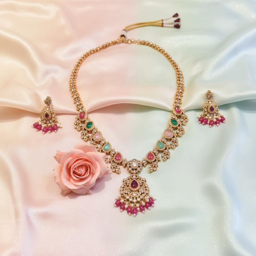 Adorned with vibrant stones and delicate artistry, this haram set is crafted to capture attention and hearts. Perfect for celebrating life’s cherished moments with a fusion of luxury and elegance. Let your inner radiance shine with every dazzling detail!